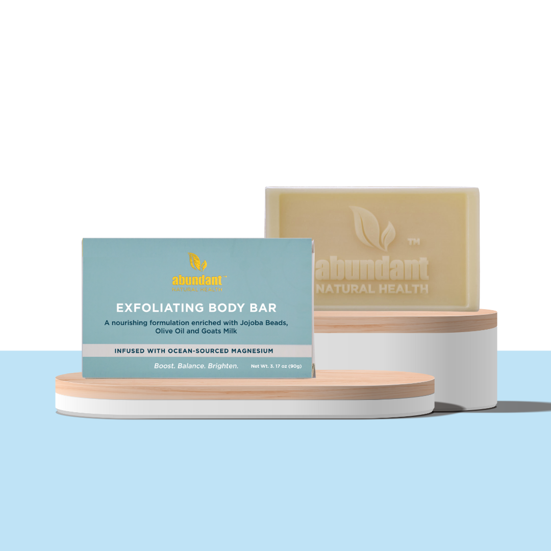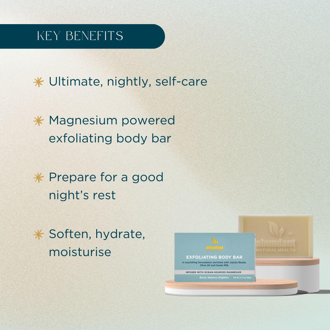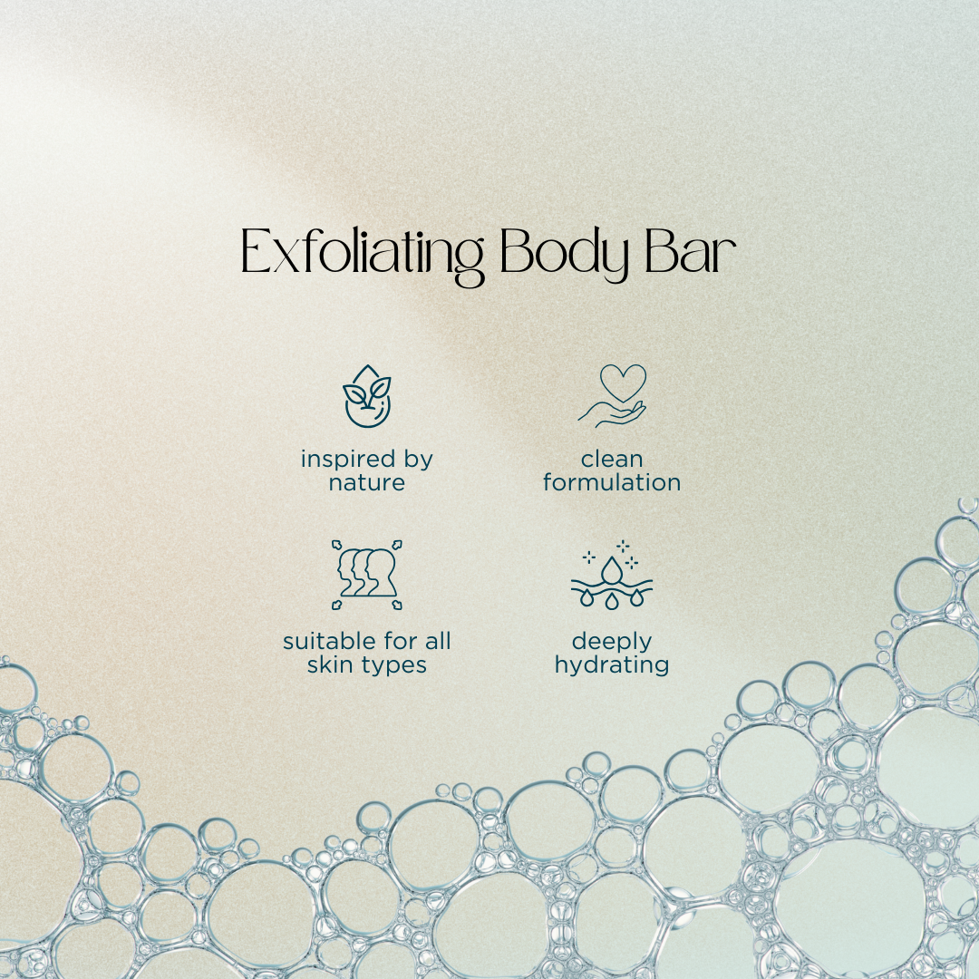 Inspired by natural ingredients, our Exfoliating Body Bar combines antioxidant-rich goat's milk and olive oil for deep, nourishing hydration. Enriched with soothing ocean-sourced Magnesium and biodegradable jojoba beads, it gently exfoliates and moisturizes, leaving your skin smooth, soft and revitalized.